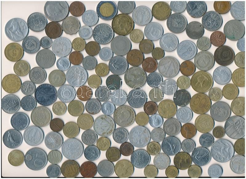 Vegyes magyar és külföldi fémpénz tétel ~470g-os súlyban, közte Franciaország 1950-1952. 10Fr - 50Fr Al-Br (3xklf) + Amerikai Egyesült Államok 1971. 1/2$ Cu-Ni "Kennedy" + Argentína 1979. 100P Al-Br "Patagónia meghódítása" + Mongólia 1970. 20M Cu-Ni T:vegyes