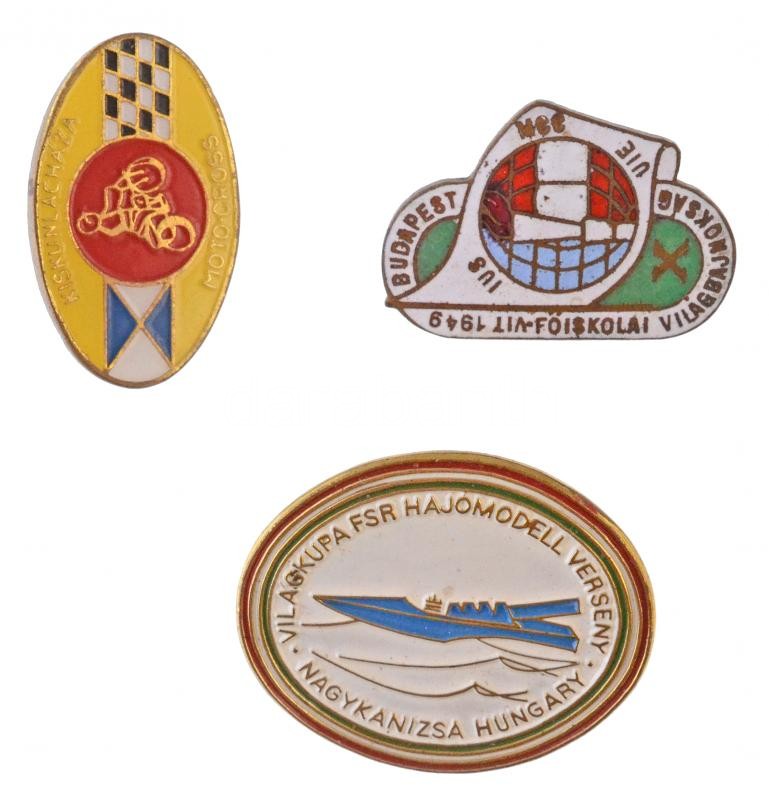 1949. "Főiskolai Világbajnokság Budapest" zománcozott fém jelvény + DN "Világkupa FSR Hajómodell Verseny - Nagykanizsa Hungary" aranyozott, festett fém jelvény + DN "Kiskunlacháza - Motocross" festett, műgyantás fém jelvény T:1-2