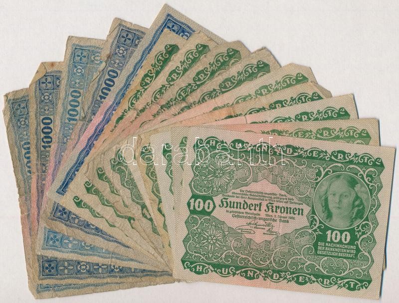 Austria 1922. 100 Kronen (5x) + 1000 Kronen (9x) C:XF,F Krause#77,78
