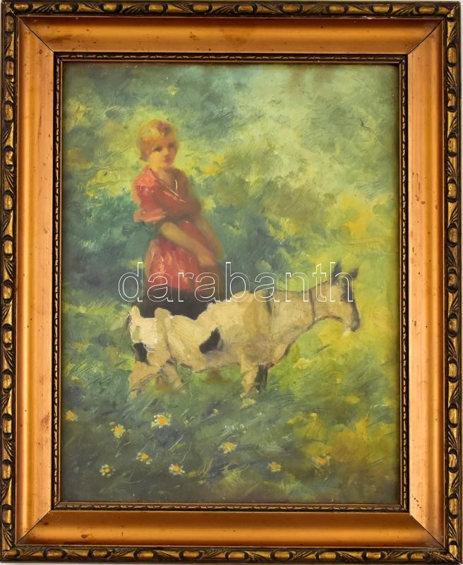 Description: Olvashatatlan jelzéssel: Lány kecskével. Olaj, karton, aranyozott, üvegezett fa keretben. Hátoldalán régi, töredékes, 1920-40 körüli képkereskedés címkéjével. 32,5x24,5 cm