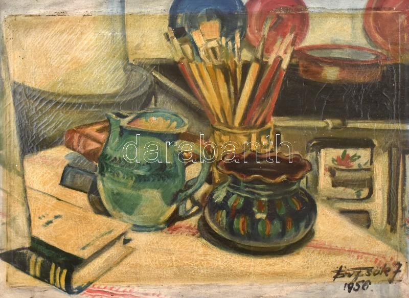https://www.darabanth.com/en/377-Online-auction/377.0/Paintings-and-graphics/Paintings-and-graphics~1/Torzsok-J-1956-jelzessel-Csendelet-festoecsetekkel-Olaj-vaszon-keretben-43C39758-cm~II2188891