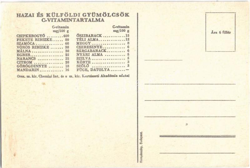 Gyorsan vegyen gyümölcsöt! Magyar egészségügyi propaganda, C-vitamin táblázat a hátoldalon / Hungarian health campaign propaganda, Vitamin C chart