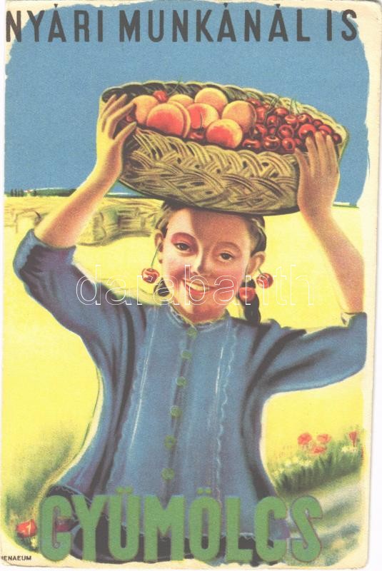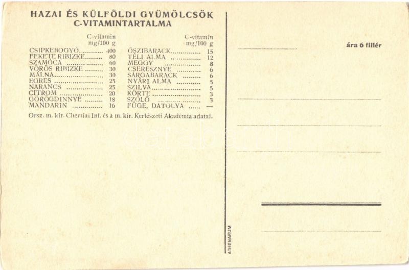 Description: Nyári munkánál is gyümölcs! Magyar egészségügyi propaganda, C-vitamin táblázat a hátoldalon. M. kir. Földművelődésügyi Minisztérium kiadványa / Hungarian health campaign propaganda, Vitamin C chart s: Vöczköndy (EK)
