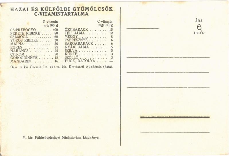 Description: Tízpercben gyömölcs! Magyar egészségügyi propaganda, C-vitamin táblázat a hátoldalon. M. kir. Földművelésügyi Minisztérium kiadványa / Hungarian health campaign propaganda, Vitamin C chart s: Vöczköndy