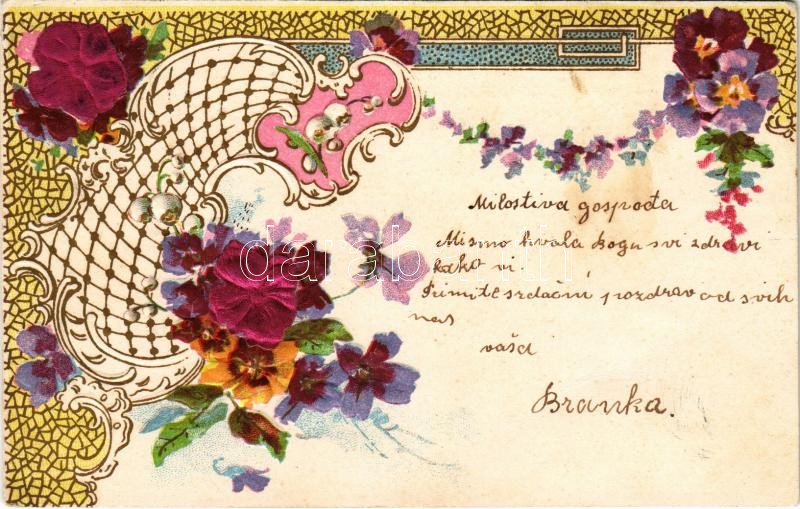 1902 Art Nouveau, floral, greeting silk card, Emb, litho