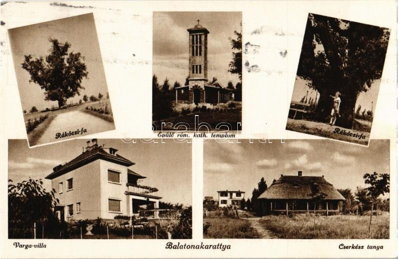 Balatonakarattya, Rákóczi fa, épülő Római katolikus templom, Varga villa, Cserkész tanya