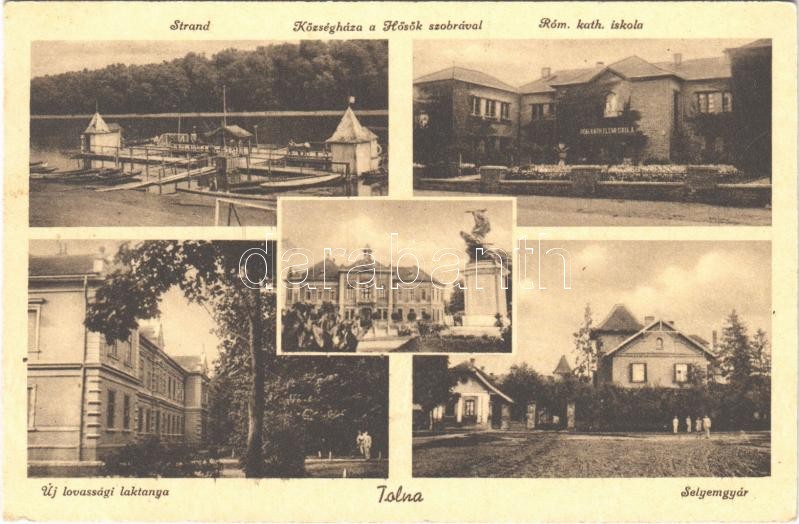 Tolna, strand, Római katolikus iskola, Selyemgyár, új lovassági laktanya, községháza, Hősök szobra (Rb)