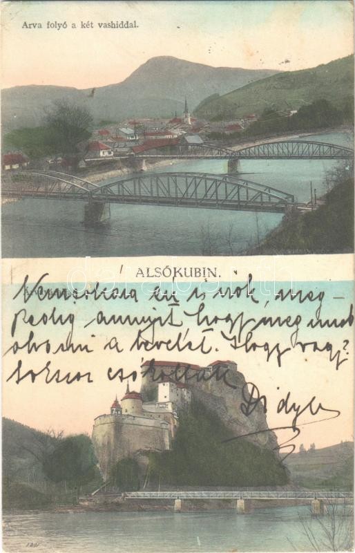 1913 Alsókubin, Dolny Kubín; Árva folyó a két vashíddal, vasúti hidak,... https://www.darabanth.com/en/377-Online-auction/377.0/Postcards/Slovakia~2000008/1913-Alsokubin-Dolny-Kubin-Arva-folyo-a-ket-vashiddal-vasuti-hidak-Arva-vara-Szollarik~II2220795