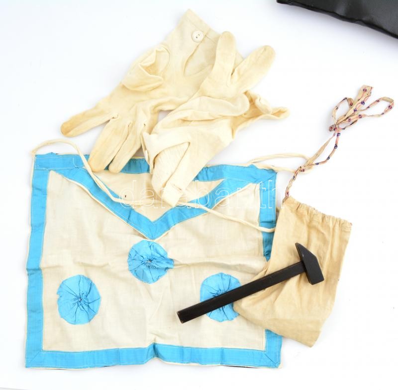 Progressio páholy Szabadkőműves kötény, kesztyű és kalapács zsákban, h... https://www.darabanth.com/en/378-Online-auction/378.0/Art-and-other-collectibles/Antique~500008/Progressio-paholy-Szabadkomuves-koteny-kesztyu-es-kalapacs-zsakban-hozza-valo-bor-tokk~II2158891