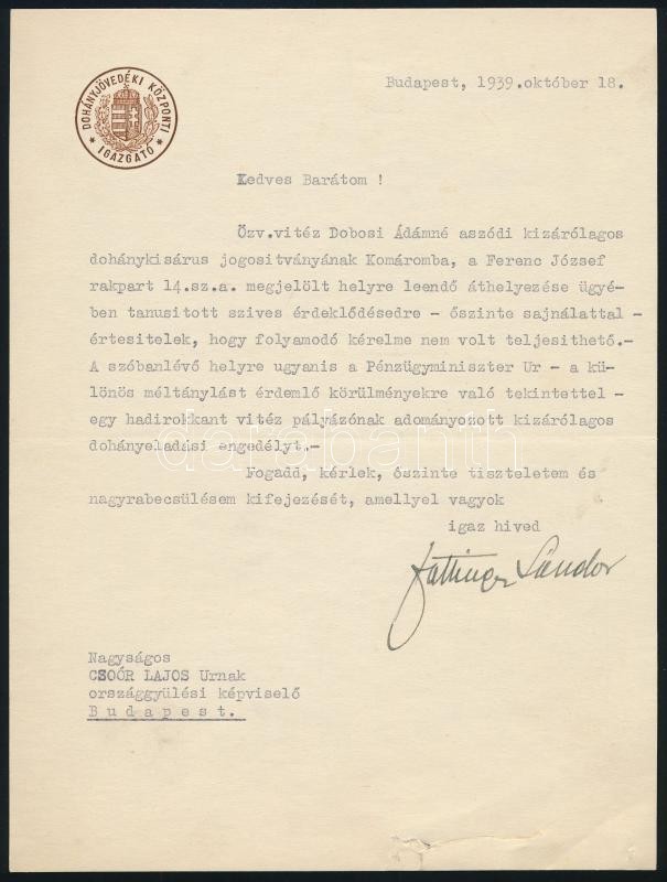 1939 Bp., Dohányjövedék Központi Igazgató fejléces levélpapírjára írt levél, aláírással