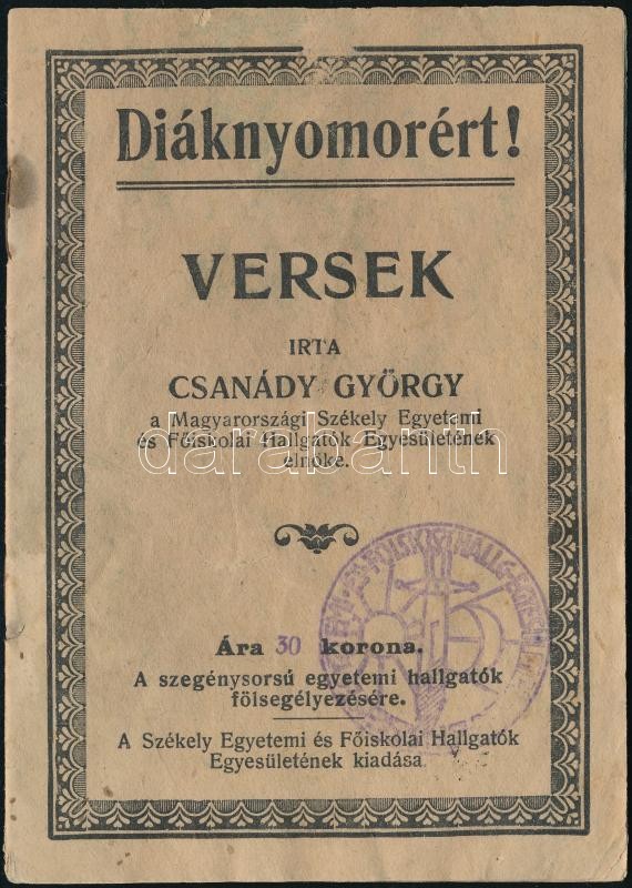 https://www.darabanth.com/en/378-Online-auction/378.0/Art-and-other-collectibles/Printed-Materials~500031/Csanady-Gyorgy-Diaknyomorert-Versek-Bp-1923-Szekely-Egyetemi-es-Foiskolai-Hallgatok-Egy~II2002760