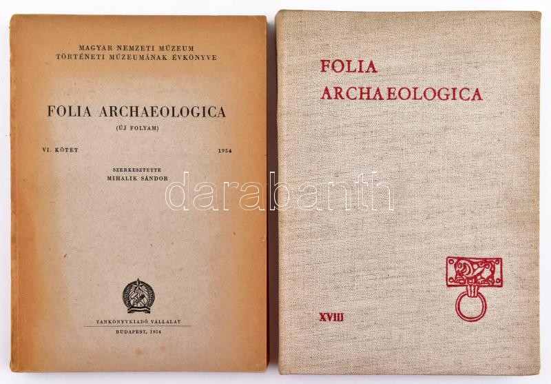 Description: Mihalik Sándor: Folia archaeologica. A Magyar Nemzeti Múzeum Történeti Múzeumának évkönyve. VI. kötet. Bp., 1954, Tankönyvkiadó Vállalat. Kiadói papír kötésben. + Sárdy Judit (szerk.): Folia archaeologica. A Magyar Nemzeti Múzeum évkönyve. XVIII. évkönyve. Bp., 1966/1967, Múzeumi Ismeretterjesztő Központ. Kiadói vászon kötésben.