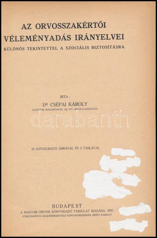 Dr. Csépai Károly : Az orvosszakértői véleményadás irányelvei. Különös tekintettel a szociális biztosításra. Magyar Orvosi Könyvkiadó Társulat Könyvtára CLII. kötet. Bp.,1938., Rényi Károly, VII+222+1 p. Kiadói aranyozott egészvászon-kötésben, kissé kopott borítóval, az első négy lap sérült, kijár (előzéklap, címlap, tartalomjegyzék.