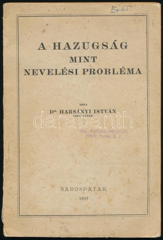 Harsányi István: A hazugság mint nevelési probléma. Sárospatak, 1935., (Fischer Lajos-ny.), 139+1 p. Kiadói papírkötés, a borítón szakadással, kissé foltos, bélyegzésekkel. A szerző, Harsányi István (1908-2002) a 20. századi magyar tehetséggondozás kiemelkedő alakja, publicista, tanár, id. Harsányi István (1874-1928) irodalomtörténész, könyvtáros, teológus, a sárospataki református teológiai akadémia tanára fia által dedikált.