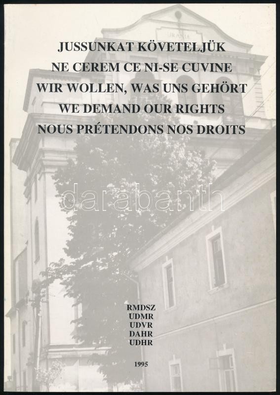 Description: Jussunkat követeljük - RMDSZ. Az épületek egész oldalas fekete-fehér fotóival. Kolozsvár, 1995, Gloria Nyomda. Magyar, román, német, angol és francia nyelven. Kiadói papírkötésben, enyhén foltos állapotban