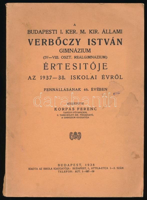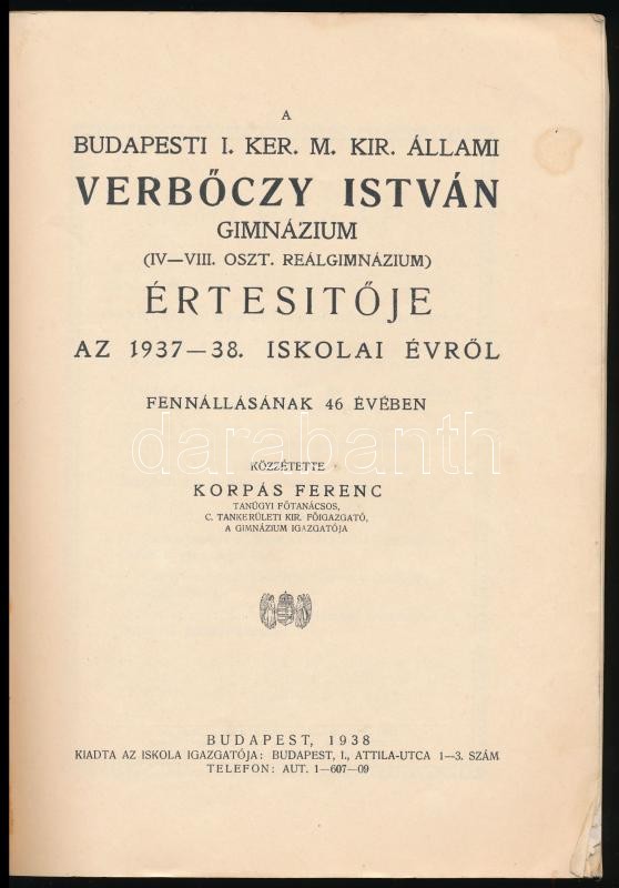 1938 Budapesti I. Ker. M. Állami Verbőczy István Gimnázium értesítője ... https://www.darabanth.com/en/378-Online-auction/378.0/Books/Books-Travelling-Local-History~1000001/1938-Budapesti-I-Ker-M-Allami-Verboczy-Istvan-Gimnazium-ertesitoje-az-1937-1938-iskolai-C3~II2198261