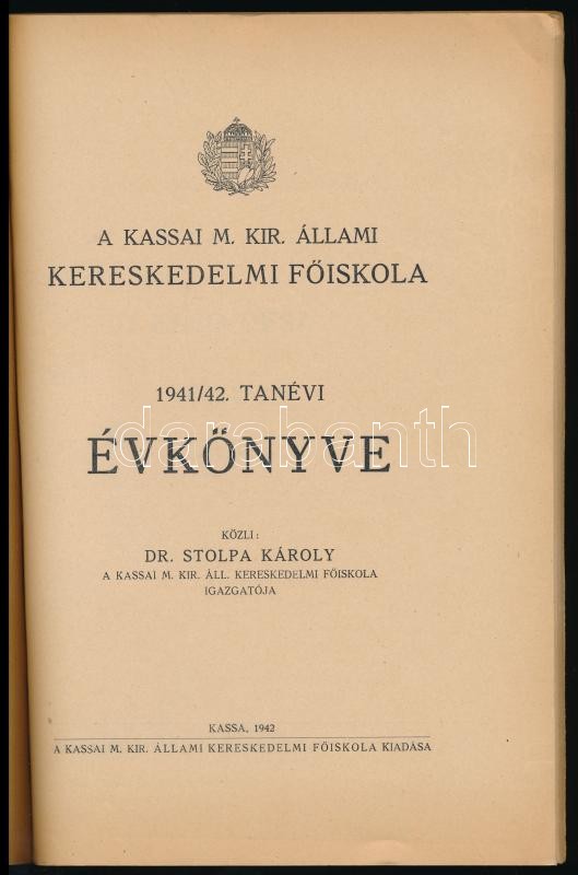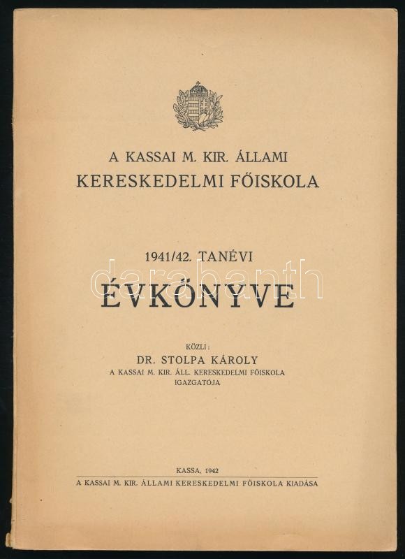 1942 Kassai M. Kir. Állami Kereskedelmi Főiskola 1941/42 tanévi évkönyve. Közli: Stolpa Károly. Kassa, 1942., Kassai M. Kir. Állami Kereskedelmi Főiskola. Papírkötésben.