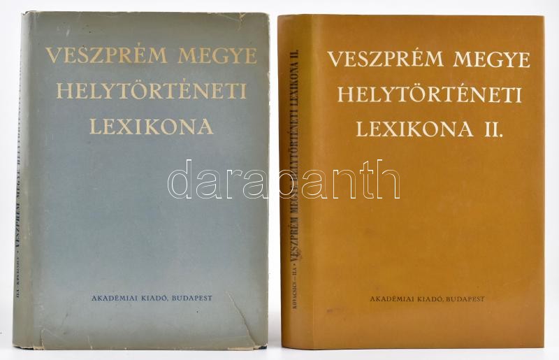 Description: Kovacsics József-Ila Bálint: Veszprém megye helytörténeti lexikona I-II. köt. Magyarország Helytörténeti Lexikona. Bp.,1964-1988, Akadémiai Kiadó. Kiadói egészvászon-kötés, kiadói papír védőborítóban, az I. kötet borítója szakadt. Az I. kötet 1800 példányban jelent meg.