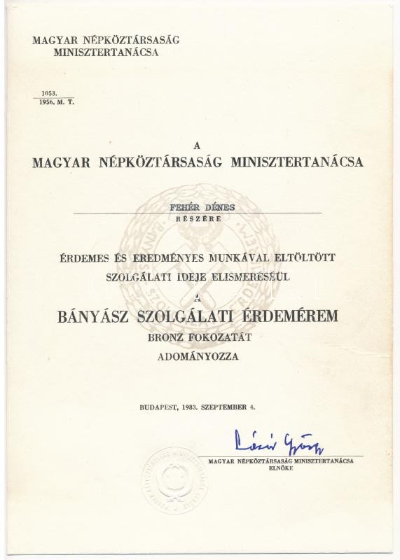 1983. "Bányász Szolgálati Érdemérem" bronz fokozata, Br kitüntetés mellszalaggal, adományozói okirattal, Lázár György miniszterelnök (1975-1987) eredeti aláírásával, eredeti tokban + DN "Törzsgárda" zománcozott kitűző (12x15mm) T:2