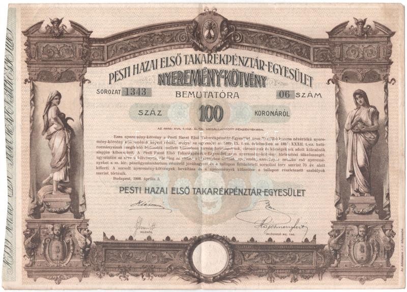 https://www.darabanth.com/en/378-Online-auction/378.0/Numismatics/Shares-and-Tickets~2000004/Budapest-1906-Pesti-Hazai-Elso-Takarekpenztar-Egyesulet-100K-rol-szolo-nyeremenykotven~II2204054