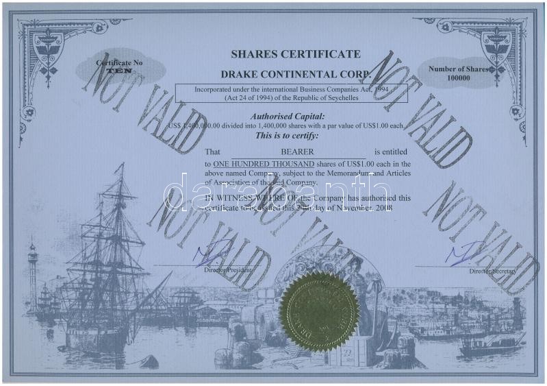 Republic of Seychelles 2008."Drake Continental Corporation" share about 100.000$ with "NOT VALID" overprints C:UNC