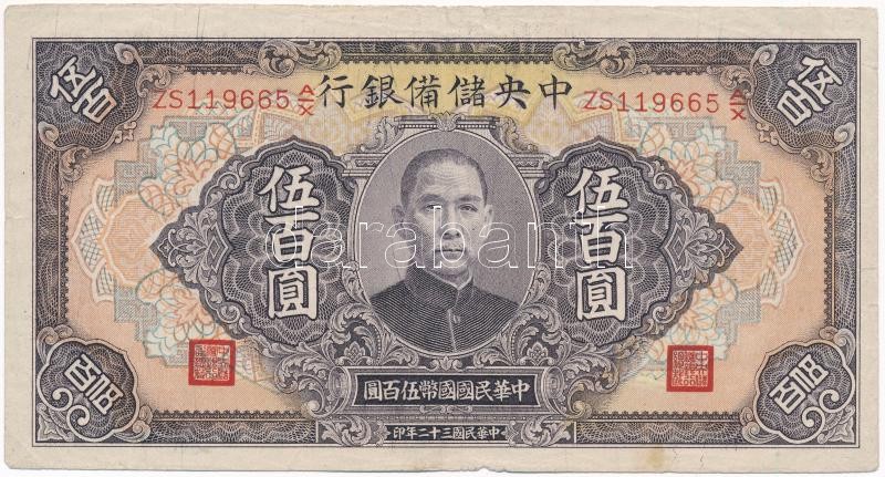 Kína / The Central Reserve Bank of China 1943. 500Y lila T:III beszaka... https://www.darabanth.com/en/378-Online-auction/378.0/Numismatics/Worldwide-banknotes~2000012/Kina-The-Central-Reserve-Bank-of-China-1943-500Y-lila-TIII-beszakadasok-China-The-Central-R~II2231387