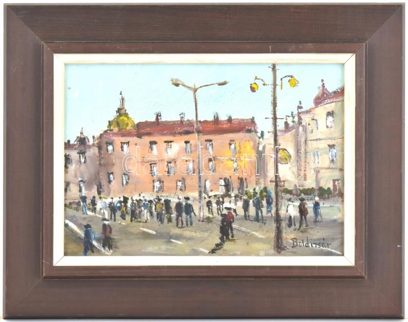 Boldizsár jelzéssel: Nagyvárosi forgatag. Olaj, karton. fa keretben, 2...