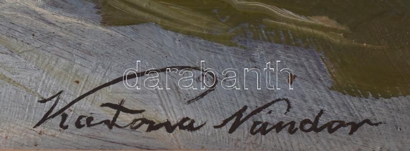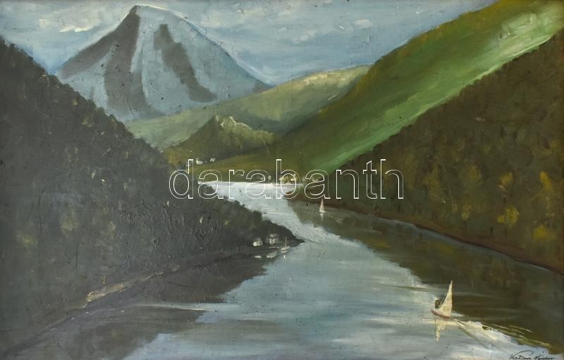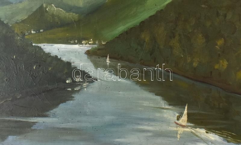 Katona jelzéssel: Hegyvidéki tó vitorlásokkal. Olaj, farost, fa keretb...