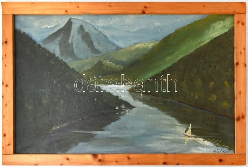 Katona jelzéssel: Hegyvidéki tó vitorlásokkal. Olaj, farost, fa keretben, 58x90 cm