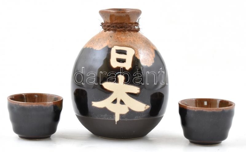 Japán festett, mázas kerámia kiöntő, 2 db kupicával, hibátlan, m: 4 és...