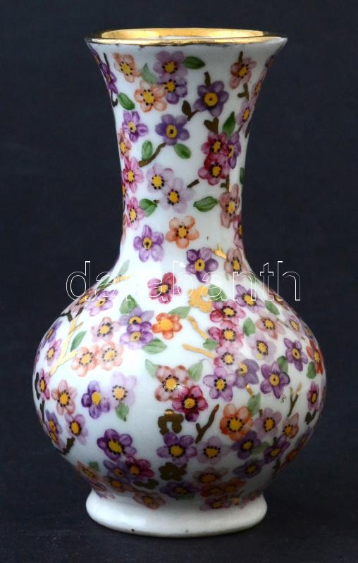 Oscar Schlegelmilch virágmintás porcelán kis váza, kézzel festett, jelzett, kis kopásnyomokkal, m: 10,5 cm