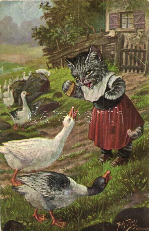 Cat feeding the ducks. T. S. N. Serie 1830. (6 Dess.) s: Arthur Thiele...