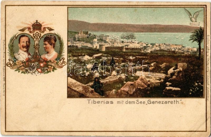 Description: Tiberias mit dem See Genezareth. Die Kaiser-Reise durch Palästine 1898. Karte No. 13. Kunstverlag H. Vogel / Wilhelm II and Augusta Victoria of Schleswig-Holstein visiting Palestine. Judaica, floral, litho (EK)