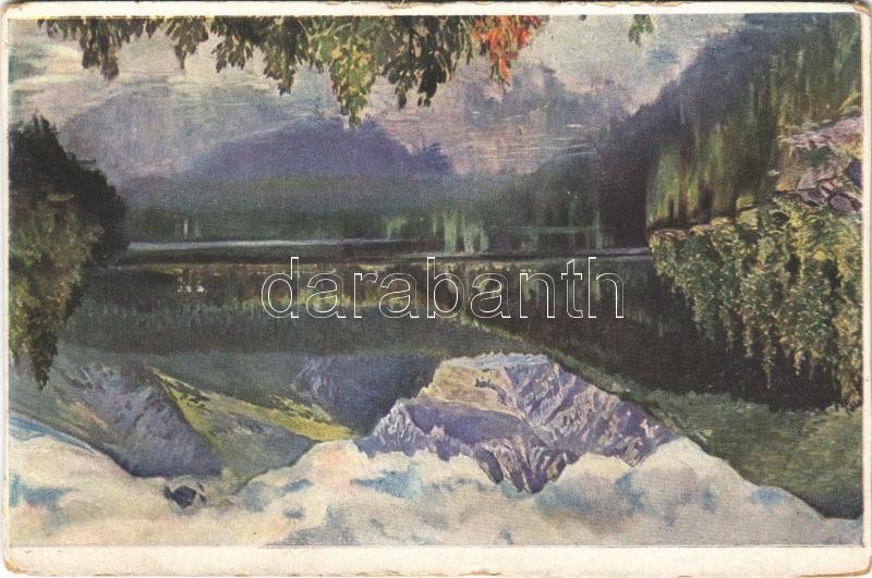 Description: 1921 Tátra, Magas Tátra, Vysoké Tatry; Lázne Strbské pleso. Pohlad na Patriu, Rysy, Vysokou a Ostervu / Csorba-tó / lake, bath, mountain peaks s: E. Kosy (vágott / cut)