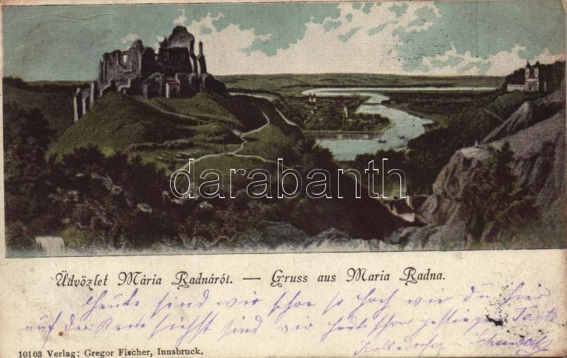 Description: 1900 Lippa, Lipova; Solymoser Ruine, Lippa und der Marosfluss, Mária-Radna mit der Kirche / Solymosi vár, Lippa és a Maros folyó, Máriaradnai kegytemplom / Soimos castle, Lipova with Mures river, pilgrimage church in Radna (Rb)