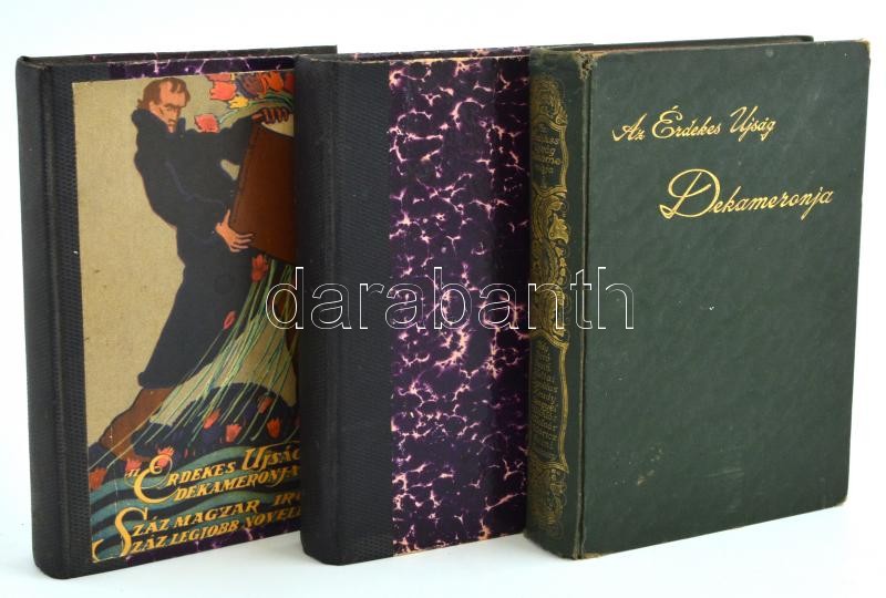 Az Érdekes Újság Dekameronja. I-II. köt. Száz magyar író száz legjobb novellája. Szerk. Kabos Ede. Az első kötetből egy duplummal. Összesen 3 kötet. Bp., 1913, Légrády, 315+2 p.+12 t.; 319+1 p.+10 t. Ady Endre, Csáth Géza, Krúdy Gyula, Molnár Ferenc, Móricz Zsigmond, Babits Mihály, Bródy Sándor, Herczeg Ferenc, Kosztoláyni Dezső, Mikszáth Kálmán és mások képeivel illusztrált. Átkötött félvászon-kötésben, az egyikre az eredeti elülső, illusztrált papírborítót kasírozták, kissé kopott borítókkal, és kiadói aranyozott egészvászon-kötés, kissé kopott borítóval, kissé sérült gerinccel.