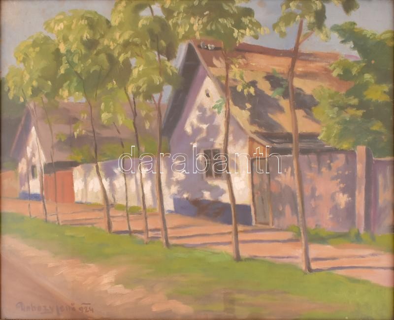 Dobozy Jenő (?-?): Napfényes utca. Olaj, vászon, jelzett és datált (Dobozy Jenő 924). Üvegezett, sérült régi fa keretben, 48×58 cm