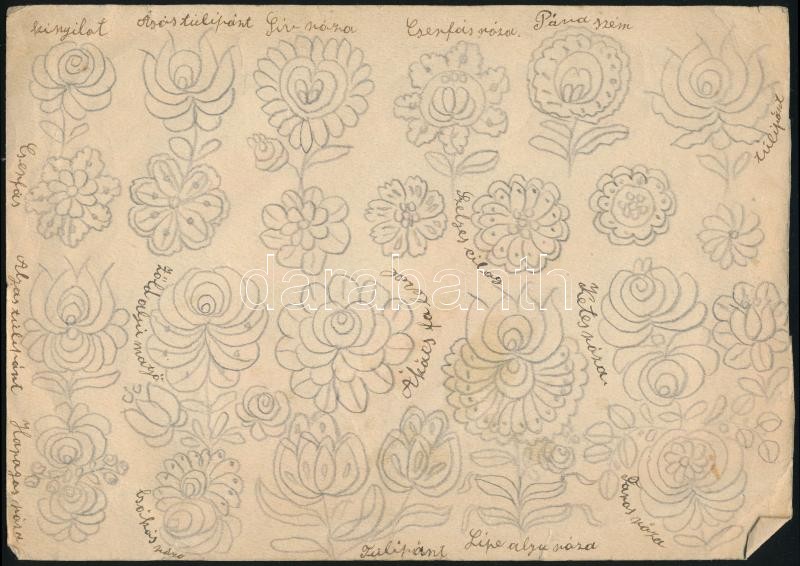 Kis Jankó Bori (Gáspárné Molnár Borbála) (1876-1954): Mezőkövesdi matyó hímzésminták, 2 db, ceruza, papír, jelzett, 21×13,5 és 25×17 cm