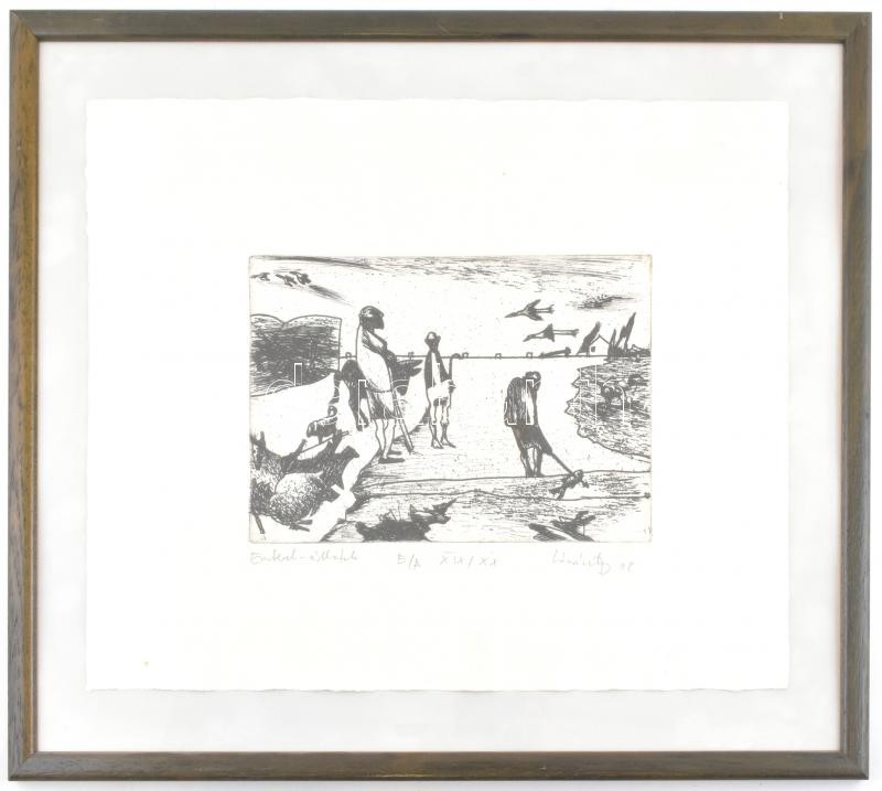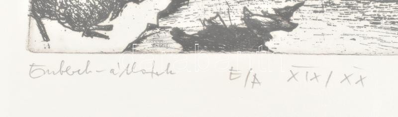 Lóránt János Demeter (1938): Emberek - állatok. Rézkarc, merített papír, jelzett, művészpéldány E/A XIX/XX. Üvegezett fa keretben, 19,5x28,5 cm