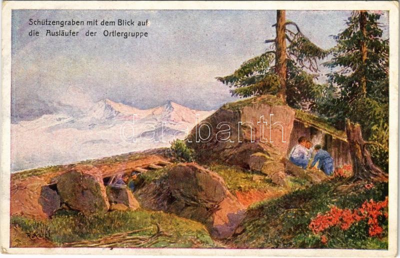 Description: Schützengraben mit dem Blick auf die Ausländer der Ortlergruppe. Offizielle Karte für Rotes Kreuz, Kriegsfürsorgeamt Kriegshilfsbüro Nr. 214. / WWI Austro-Hungarian K.u.K. military art postcard, charity fund s: Rudolf Kargl (EK)
