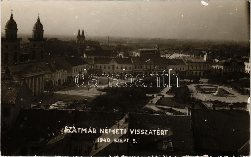 1940 Szatmárnémeti, Satu Mare; Szatmárnémeti visszatért, bevonulás, gyógyszertár, Szabó Lajos, Fábián István, Baller József, Hegedűs üzlete, katonák, autóbuszok, magyar zászlók / entry of the Hungarian troops, shops, pharmacy, soldiers, autobus, Hungarian flags. photo + "MAGYAR KIRÁLYI MOZGÓPOSTA"