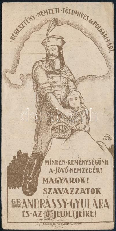 Description: 1922 "Minden reménységünk a jövő nemzedék! Magyarok! Szavazzatok gr. Andrássy Gyulára és az ő jelöltjeire. Keresztény Nemzeti Földmíves és Polgári Párt", politikai reklámos számolócédula, rajta "Nagymagyarország-térképes" irredenta grafikával, Bp., Kellner és Mohrlüder-ny., jelzett (Verő B. 922) a nyomaton, 14x7 cm