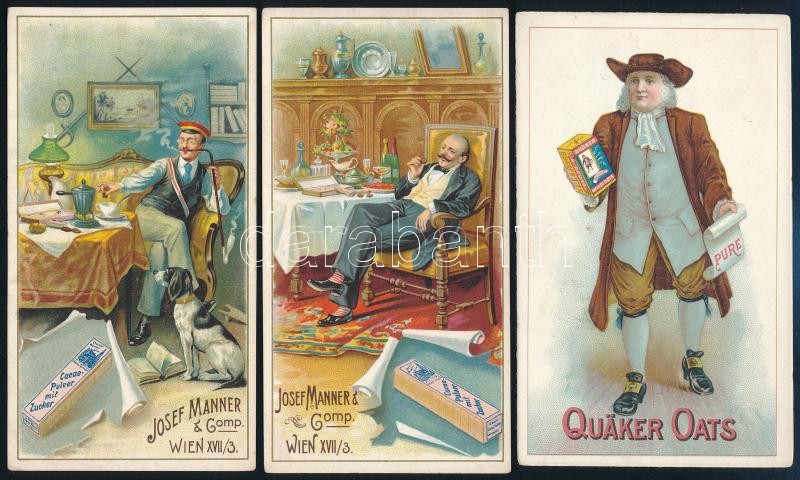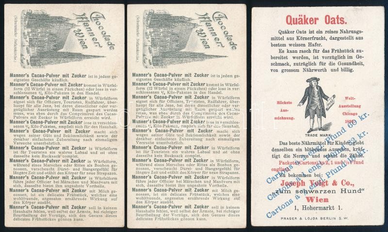 cca 1910-1920 Josef Manner & Comp. Wien / Quäker Oats, 3 db német nyelvű, illusztrált litho reklám kártya, 13x7 cm
