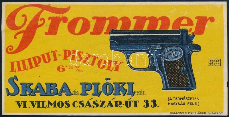 cca 1920 Frommer Liliput-pisztoly 6, 35 mm., Skaba és Plökinél, reklámos litografált számolócédula, jelzett a nyomaton (Zsolt Géza), Bp., Kellner és Mohrlüder-ny., 7x13,5 c,