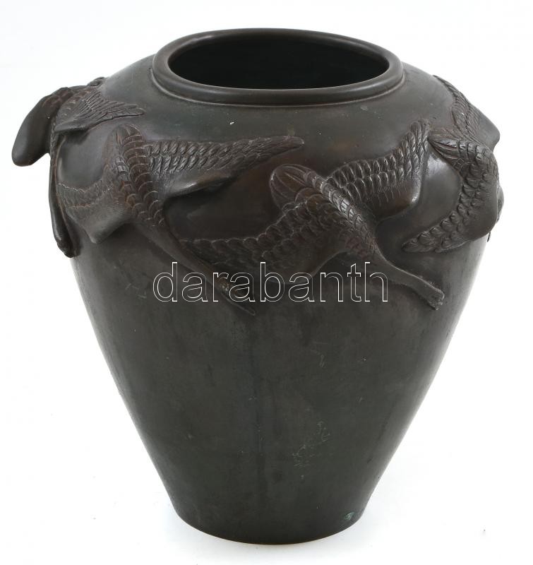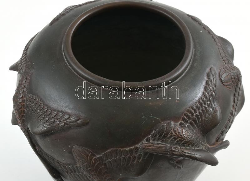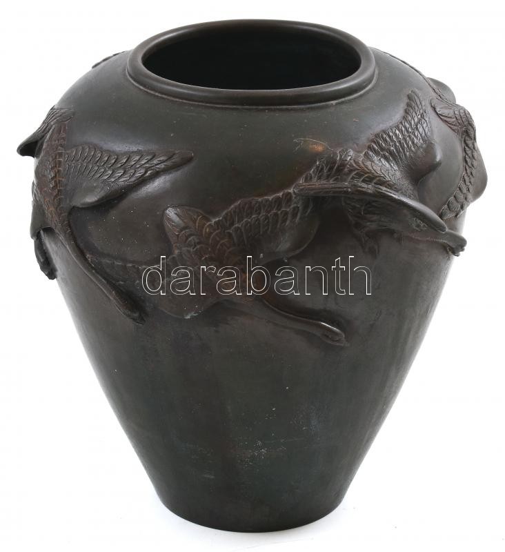 Japán váza. Öntött, patinázott bronz. Felületén relief japán daru madarak. Japán, Meiji-kor, 1900 körül. Jelzett. m: 20 cm, d: 20 cm