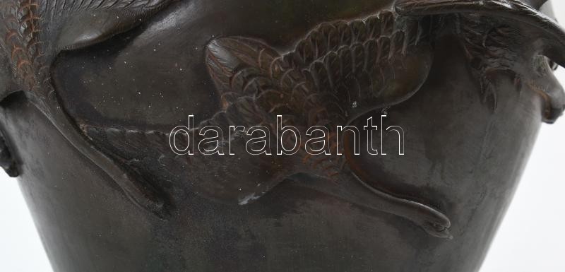 Japán váza. Öntött, patinázott bronz. Felületén relief japán daru mada...