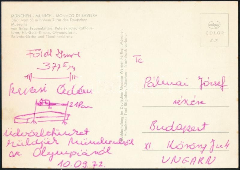 1972 Földi Imre olimpiai bajnok súlyemelő és Szepesi Ádám atléta által aláírt és rajzolt képeslap a müncheni olimpiáról.