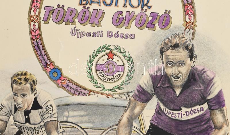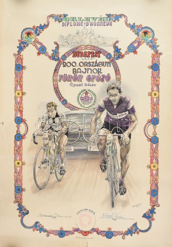 1959 Bp., a Budapesti Kerékpáros Szövetség által kiállított, kézzel rajzolt, grafikus oklevél, a 200 km-es országúti bajnokság győztese, Török Győző (1935-1987), az Újpesti Dózsa kerékpárosa részére. Vegyes technika, papír, jelzett (Szakács S. 1959). A Budapesti Kerékpáros Szövetség elnökének és titkárának aláírásával, pecsétjével. Hártyapapírral, a hártyapapíron és a hátoldalon Szakács S. festő, grafikus pecsétjével jelzett. Szélein sérült, szakadozott. Feltekerve, 59x42 cm