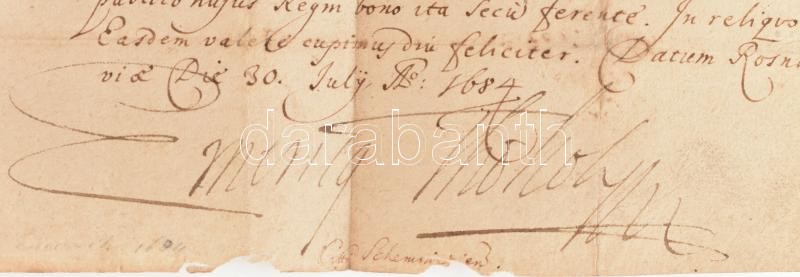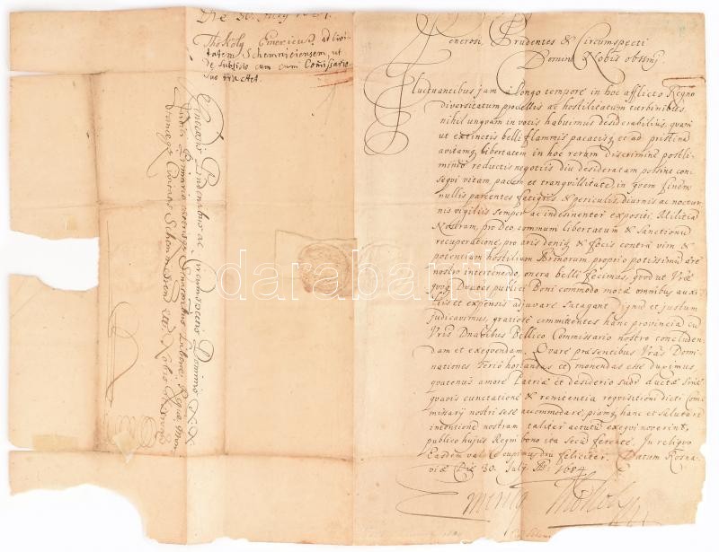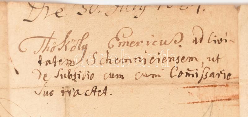 1684 Rozsnyó, Thököly Imre levele Selmecbánya magisztrátusának, amelyben kéri őket, hogy (meg nem nevezett) hadbiztosa útján küldjenek neki segélyt (subsidium). Papír, Thököly aláírásával, papírfelzetes rányomott viaszpecséttel, hátulján későbbi feljegyzéssel. 1684 Rožňava, a letter sent by Emeric Thököly to the magsitrate of Schemnitz in which he asks them to support him via his military commissioner. On paper with Thököly's signature and vax seal on it, with later notes on its back. Egy beírt oldal