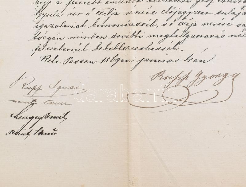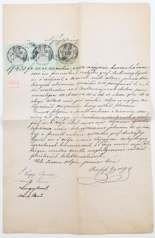 Description: 1869 Andrássy Gyula grófnak eladott pesti városligeti földek vételárának kiegyenlítéséről valamint tulajdonjog bekebelezési engedély Rupp György termény nagykereskedőtől, budapesti virilistől, aláírásával.